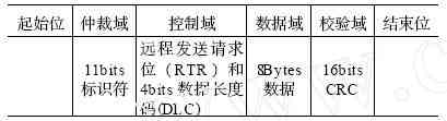 本系统定义在CAN总线上传输的数据包为标准帧格式,它分为远程帧和数据帧两种,区别远程发送请求位是否置位。标准帧的数据结构如表1所示。