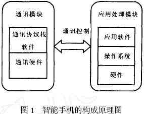 本文所提及的智能手机操作系统以及各种应用程序也就运行在这个CPU 上面。应用处理模块和通讯模块之间靠通讯控制模块相连。结构示意图如图1 所示。