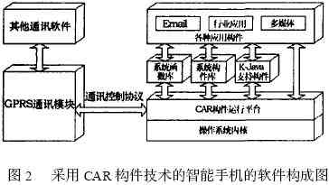 图2 描述的是一个采用GPRS 功能的智能手 机的软件构成图。其中智能手机操作系统直接控制的是图2 右边的应用模块。从图中可以看出,CAR 构件平台运行在操作系统内核之上,一方面,它与内核联系紧密,替内核接管了负责整个系统中应用程序运行的任务;另一方面,它又是一个相对独立的模块,这样能够方便地进行移植,让更多的系统都能运行CAR 构件,保持着CAR 构件的软件平台无关性。CAR 构件运行平台支持系统级和应用级两个层次的构件的运行。同时,该系统也提供了一些函数库,比如C 的库函数,在一定程度上兼容以前编写的一些应用软件。另外,如今的智能手机都支持丰富的JAVA 应用程序,所以该系统也提供了专门的构件来运行K- J ava 程序。