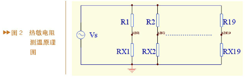 测量热敏电阻阻值的电路原理与测量恒温箱温度的原理相似,如图2所示。图中,电压源是由LM317组成的可调电压源,大小为3.8V,R1至R19为2kΩ的高精密电阻器,温度系数(TCR)为15PPM。下部电阻RX1至RX19为待测的热敏电阻。两电阻的连结点AIN1到AIN19的电压被送往AD7731的电压输入端。当下部的热敏电阻阻值随温度发生变化时,AINX点的电压也随之改变,通过它可以测得阻值的变化情况。