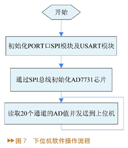 具体操作流程如图7所示。其中,SPI和USART都属于单片机内部模块,只需对模块的相关寄存器进行设定即可,而对于AD7731芯片的控制则需要通过SPI模块间接进行。