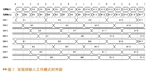 双视频输入工作时序图如图2所示。每个视频通道拥有四个6416图像处理单元,分别采用流水工作模式,每片6416处理一幅图像的最大周期为4帧,两组的处理结果输出给图像显示模块处理。