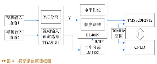 基于2812-DSP的视频信号采集原理框图如图4所示,其中包括视频预处理模块和2812 模块。视频预处理模块包括Y/C分离、电平钳位、同步分离、幅度调整处理电路。2812-DSP片上A/D以12.5M的速度采集视频信号,达到了极限采样速率(采样间隔时间为80ns)。