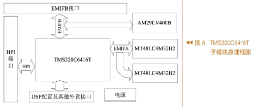 此模块是本系统处理部分的核心模块。按照通用性强、接口清晰简捷、资源引出最大化、兼顾构建多6416系统的设计思想来设计6416子模块,如图6所示。通过EMIFA接口扩展了两片4M×32bit SDRAM, 可一次读写64bit数据。