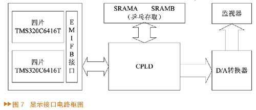 由CPLD对各个6416图像处理单元数据输出接口(EMIFB)总线进行总线仲裁,实现各个6416单元的图像数据分时输出。