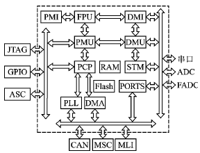TC1796的内部结构如图2所示。内部主要由PMU(Program Memory Unit,程序存储单元)、DMU(Data Memory Unit,数据存储单元)、FPU(Floating Point Unit,浮点单元)、PMI(Program Memory Interface,程序存储接口)、DMI(Data Memory Interface,数据存储接口)、PCP(Peripheral Control Processor,片内外设控制处理器)、STM(System Timer,系统定时阵列)和PLL(Phase Locked Loop,锁相环)等组成。外部接口包括ADC、FADC(快速ADC)、串口、JTAG(仿真口)、GPIO(通用I/O口)、ASC(异步串口)、CAN、MSC(Micro Second Channel,毫秒口)、MLI口等。