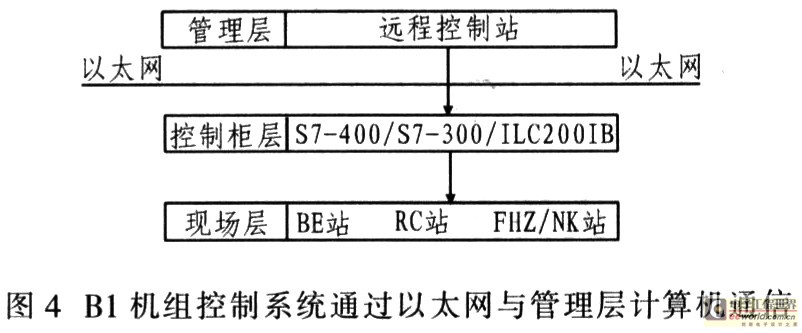 INTERBUS是德国Phoenix公司提供的工业现场总线,符合IEC61158国际标准总线。现已广泛应用于汽车工业、烟草工业、仓储及传送技术、造纸工业、包装工业、食品工业等领域。独立的诊断程序提供详细的故障信息(故障地址、故障类型和故障历史记录),诊断寄存器提供用户程序处理故障信息的工具,控制板3行16段LCD显示器直观醒目。图4为B1机组控制系统通过以太网与管理层计算机通信。