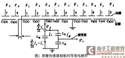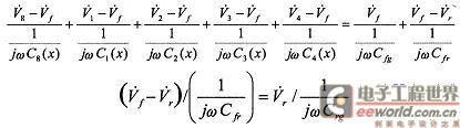 如果给容栅传感器每组发射极板上所加的发射电压V1"V8为8路频率、幅值相同而相邻小极板间相位相差为π/4的正弦交变电压,则在发射极上有电压Vf,在接收极上有电压Vr。应用交流电路理论及基尔霍夫电流定律,解读图l的等效电路,如下: