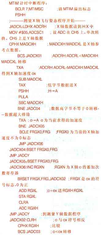 在初始化程序中:设置ADC在CH4上,ADC关中断连续转换。在CH4上是X轴数据设置,MTIM计时模块T_n时间中断一次。