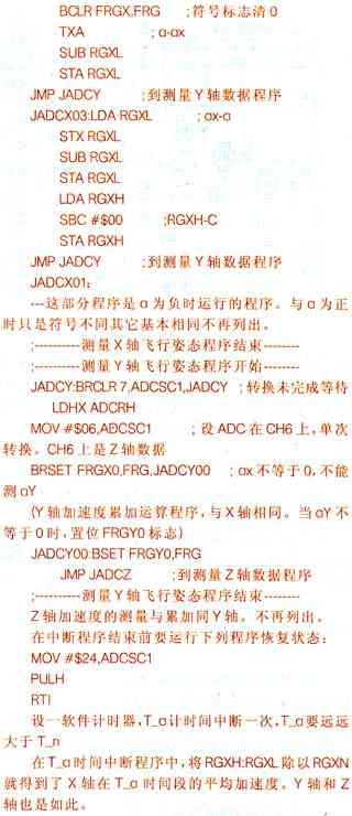 实现飞行姿态信号测量的方法是:首先用准确的时间间隔来测飞行姿态信号;将测得的数据进行比较,大于最大限制值时放弃;对于在规定范围内的数据求代数和,同时记录求和的次数;经过一段规定的时间后,将求得的代数和除以求和的次数,就得到了在这段规定时间的平均值。用计时器设一个定期的时间中断就可实现测量时间的准确间隔。