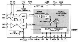 ADE7755是一种高精度的电量计量芯片,在工频情况下,在500:1的动态范围内,精度达到0.1%。技术指标超过了IEC1036标准的要求。