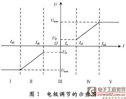 横坐标表示电弧电流值,纵坐标表示PLC的输出控制信号(-10~10 V),在工区电弧电流远远小于弧流额定值,PLC输出的控制电压为Umin,电极以最大的设定速度下降,该区也称为下降饱和速度区。在Ⅱ区电弧电流小于弧流额定值,电极以速度线性减小下降,改变该区的宽度就可以改变直线的斜率,也就调节了灵敏度,该区也称为电极下降速度调节区。在Ⅲ区电弧电流等于或近似等于弧流额定值,PLC输出的控制电压为0,电极保持静止不动,该区也称为非调节区或死区。在Ⅳ区电弧电流大于弧流额定值,电极以速度线性增加上升,改变该区的宽度就可以改变直线的斜率,也就调节了灵敏度,该区也称为电极上升速度调节区。在V区电弧电流远远大于弧流额定值,PLC输出的控制电压为Umax,电极以最大的设定速度上升,该区也称为上升饱和速度区。在非调节区与相邻两区的边界点,PLC输出的控制电压为±Up,Up为液压伺服阀功率放大板的输入门槛电压值,0~Up的电压不能使液压阀有任何动作。