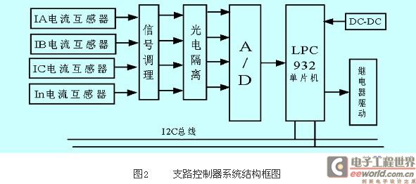 支路微处理器选用的是philips lpc932a1单片机,它是基于8051内核的高速、低功耗的8位单片机,其指令执行时间只需2到4个时钟周期。6倍于标准8051器件。支路控制器系统结构框图如图2所示。