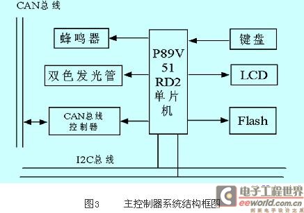 主控制器由声光报警、键盘及液晶显示、can总线控制器、外部flash和时钟/日历发生器等部分构成。主路微处理器选用的是philips p89v51rd2单片机。主控制器完成的功能主要有:采集各支路控制器传输的ia、ib、ic、in等参数数据,故障特征数据,并在lcd上实时显示,并通过can总线传输给集中控制器。此外主控制器还将各支路控制器运行状态信号用相应双色发光管显示;当有通道出现报警信号时,主控制器驱动蜂鸣器,并将实时故障特征数据保存至flash。主控制器系统结构框图如图3所示。