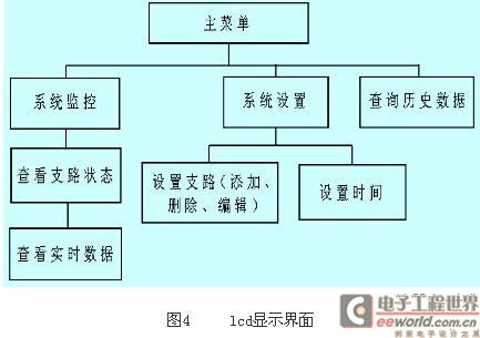 本系统中lcd显示界面如图4所示。通过系统监控界面可查看实时电流数据,数据以滚动的形式显示。用户通过系统设置界面可以设置当前时间以及支路控制器的地址。添加,删除支路,对支路的预警电流值,报警电流值,电流互感器变比,预警延时时间,报警延时时间进行设置。通过设置延时时间可以防止系统误动作。通过查询历史数据界面可以查询报警原因,报警时间以及报警的通道编号。