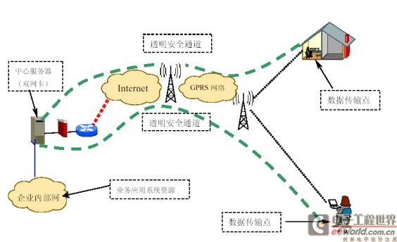 如图4所示,图中的"中心服务器"即为本系统的数据监控中心,位于GPRS子网之外,Internet网络之中,具有公网IP,它的功能相当于普通的网络服务器,但和一般的商业服务器相比有两大特点,第一,它是服务于GPRS子网用户的服务器。第二,它的服务客户对象是事先预知的。结合这两个最为显著的特点,本系统中提供了以下两种安全技术解决方案。
