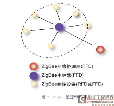中心节点为ZIGBEE协调器,终端节点为ZIGBEE终端设备