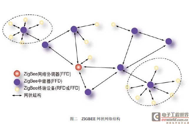 ZigBee标准基于802.15.4协议栈而建立,具备了强大的设备联网功能,它支持三种主要的自组织无线网络类型,即星型结构、网状结构(Mesh)和簇状结构(Cluster tree),特别是网状结构,具有很强的网络健壮性和系统可靠性。