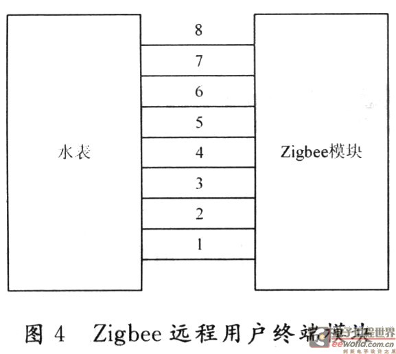 Zibbee远程用户终端模块安装于单元楼中各住户家中。在远程用户终端模块中采用8条数据线来实现读取水表数据,其中8条数据线与水表连接部分此处不做讨论。Zigbee远程用户终端模块如图4所示。其中,数据线1,2,3用于通过三线译码来控制水表数据的某位;数据线4,5,6,7用于显示水表某位上的数据;8为地线。例如,数据线1,2,3状态为000,则4,5,6,7位显示数字为水表第一位数字读数;数据线1,2,3状态为111,则 4,5,6,7位显示数字为水表第八位数字读数。在每一位读数后分别送入Zigbee模块进行处理。