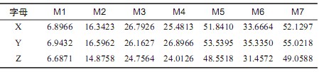 实验中,使用了全部的7Hu不变矩特征量作为手语图像整体形状描述的特征向量。形成特征空间(M1, M2, M3, M4, M5, M6, M7),如表1所示。