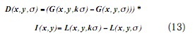 Lowe在图像二维平面空间和DoG(Difference of Gaussian)尺度空间中同时检测局部极值以作为特征点,以使特征具备良好的独特性和稳定性。DoG算子定义为两个不同尺度的高斯核的差分,其具有计算简单的特点,是归一化LoG (Laplacian of Gaussian)算子的近似。DoG算子如下式所示: