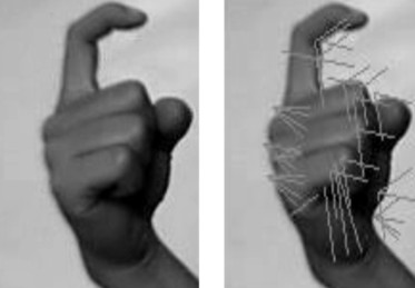 图2 (a)手语字母J原图 (b)对(a)提取SIFT特征向量