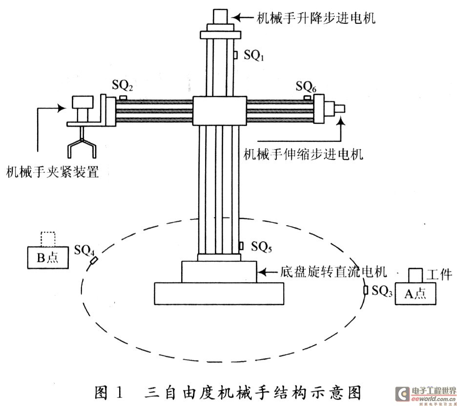机械手可以根据设定程序的动作将工件从A处搬运到B处。SQ1,SQ2,SQ5,SQ6为水平和垂直方向上的限位开关,SQ3,SQ4为原点位置和终点位置的光接近开关。