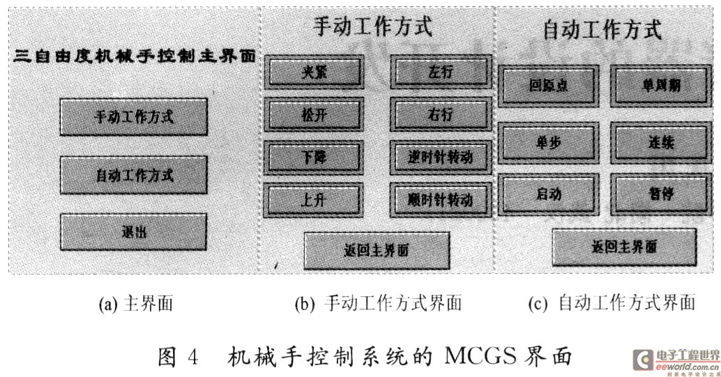 MCGS是为工业过程控制和实时监测领域服务的通用计算机系统软件,具有功能完善,操作简便,可视性好,可维护性强的突出特点。图4为三自由度机械手系统工作时的MCGS组态环境界面,它包括主界面、手动工作方式界面和自动工作方式界面。