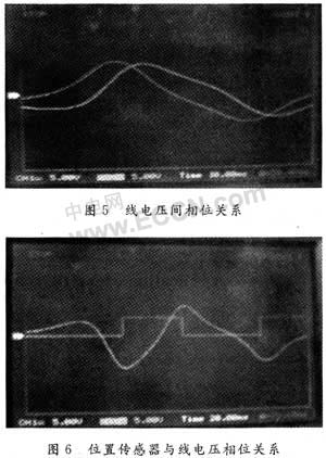 在实验中,首先确定任一绕组作为A相参考绕组,转动电机,用示波器测量另外两相与A相间线电压的相位关系,得到的线电压波形如图5所示。对比图4,两个线电压波形的相位领先的则为uBA,据此可以快速确定B相和C相。