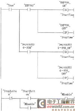 由于采用PLC vo控制,电路的控制变得异常简单,因为PLC程序取代了大部份原先电路逻辑所做的工作。S7300的16输入16输出模块主要是采集一个“启动”按钮(StartButton)和一个“停止”按钮(StopButton)的信号,通过PLC-S73110处理以后,输出控制相应的继电器间接控制设备电源关开和指示灯。3.3 PLC程序的主要控制程序简介