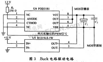 Buck电路为实现最大功率技术的主电路,采用C8051F330单片机进行控制,采用有效的算法通过软件编程由单片机输出不同占空比的PWM信号,经由U4,U5处理,如图3所示,驱动开关管Q1的导通与关断。由于单片机C8051F330的驱动电流太小,且Buck电路中MOS管与主电路不共地,故采用隔离作用的B1215LS和输出电流为0.5 A的高速光电耦合的MOS门驱动FOD3181,满足MOS管工作的要求。