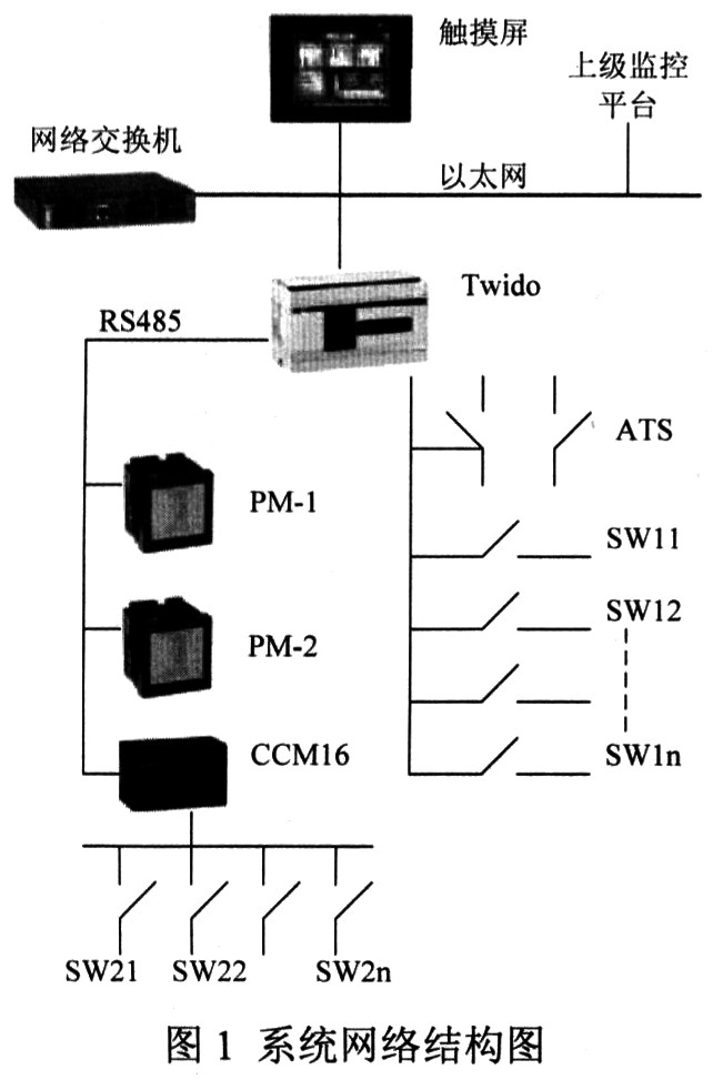 按照上述设计要求,在考虑满足性能的同时,还要兼顾整体价格的平衡,因此系统设备的选型需慎重考虑。智能控制系统不仅要完成自动控制的功能,还要完成与底层设备的现场总线通信功能。因此通过综合考虑,智能控制系统的核心设备选择了施耐德公司的小型PLC:TWDLCAFAODRF。该设备在本体有24个开关量输入点,16个开关量输出点,还可以通过扩展模块将IO点数最大扩展至264点。该设备更为强大的是有三个通信口:1个可作为通信用的编程口;1个RS485通信口;1个以太网接口,该PLC具有很强的集成与扩展能力。参阅图l中的系统结构,Twido作为核心控制单元,通过以太网上联触摸屏以及上级监控平台,通过RS485现场总线下接智能接口设备,还能通过I/O硬接线连接开关的辅助触点,完成输入输出控制。