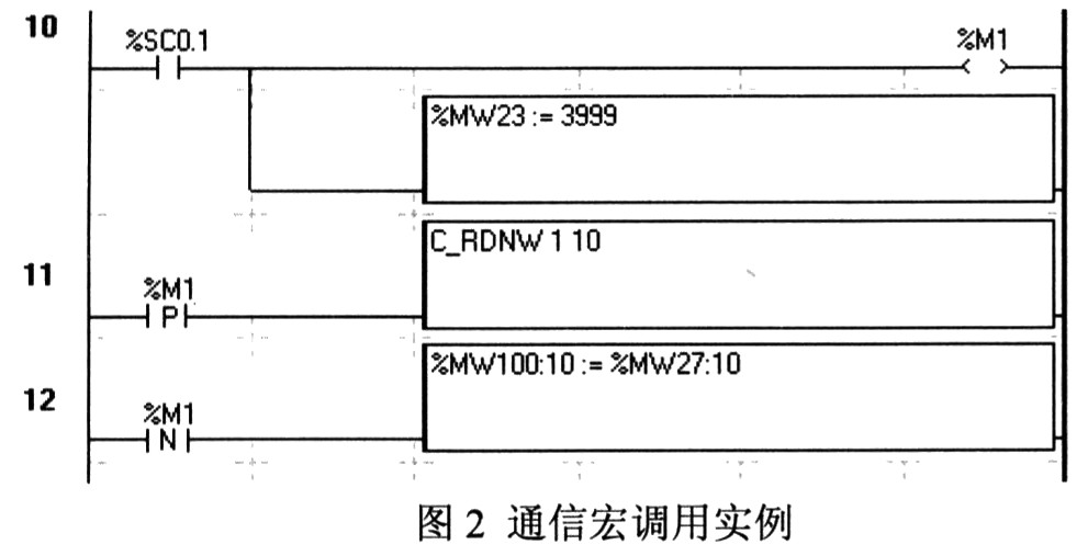 下面结合图2编程实例说通信宏调用的机理。梯形图第10行表示步进计数器的第l步发生时,使内存点%M1为l,同时将需要采集数据的首地址存入通信宏指定的临时变量%MW23。第11行表示在%Ml上升沿时调用通信宏COMMl的读N字指令,具体是读10个字。第12行表示在%Ml下降沿时,将宏读到的10个字的数值赋值到从内存点%MWl00开始的10个字。