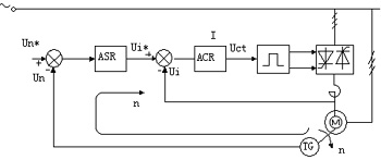 为了获得良好的动、静态性能,双闭环调速系统的两个调节器一般都采用PI调节器。两个调节器的输出都是带限幅的,转速调节器ASR的输出限幅(饱和)电压是Uin*,它决定了电流调节器给定电压的最大值,电流调节器ACR的输出限幅电压是Uctm,它限制了晶闸管变流器输出电压的最大值。