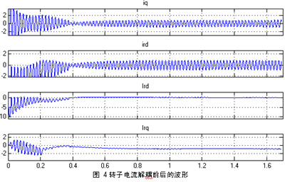 控制系统由磁场定向、坐标变换、直流调节、交流调节和电压前馈模块综合而成。经过磁场定向与坐标变换,转子电流解耦成一对转矩分量和激磁分量。下图为转子两相电
