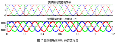 当转子电流大于0.5安培时,判断电流没到零;小于0.5安培时须过1e-5 秒的延时后再次检测电流,若仍小于0.5安,则认为电流到零了否则认为是干扰信号。判断电流到零后需先封锁当前工作的变流器后再开通另一组变流器,中间设置了1e-3秒的死区时间以防止在正负变流器之间出现环流。下图是该变频器模块输出的仿真波形(时间以秒为单位)。