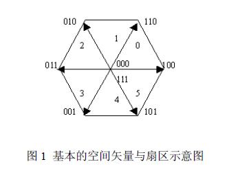 空间矢量脉宽调制SVPWM 实际上对应于交流感应电机中的三相电压源逆变器的功率器件的一种特殊的开关触发顺序和脉宽大小的组合。在采用三相逆变器对异步电机供电时,根据逆变器的工作原理可以知道,逆变桥共有23 =8 种状态,若将逆变器的八种状态用电压空间矢量来表示,则形成8 个基本的电压空间矢量,其中6 个非零矢量,2 个零矢量,每两个电压矢量在空间相隔60o,如图1 所示 。SVPWM 技术的目的是通过与基本的空间矢量对应的开关状态的组合得到一个给定的定子参考电压矢量。
