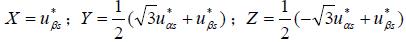参考电压矢量位于被基本空间矢量所包含的扇区中时,矢量作用时间的相对值T1 和T2 可以用X,Y 或Z 表示,它们的对应关系如表1 所示。表1T1、T2 与X、Y、Z 的对应关系表
