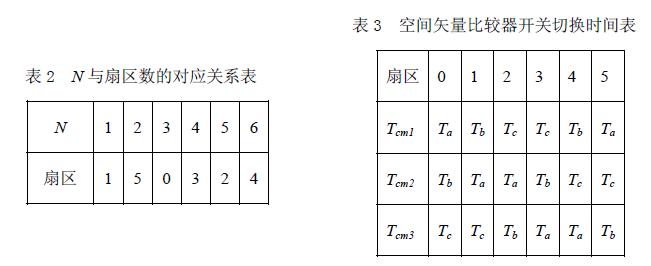 对不同扇区的T1、T2,按表1 所示取值,还要对其进行饱和判断:如果T1+T2>Tpwm, 则T1= T1*Tpwm/(T1+ T2),T2= T2*Tpwm/(T1+ T2)。