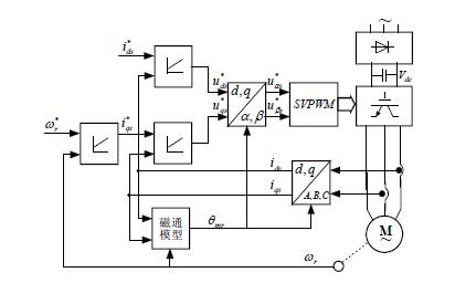 电流注入型矢量控制方案适用于中小功率、高开关频率的矢量控制系统。此时控制系统的定子参考电压完全可以由定子电流控制器提供,而无需考虑电机的定子电压方程。逆变器开关频率较高,而且电流控制器鲁棒性足够强,控制系统可以实现快速的定子电流控制,其实现方案如图3 所示。同时,这种控制技术采用空间矢量PWM 技术输出参考电压,所以它能获得很好的电流频谱。