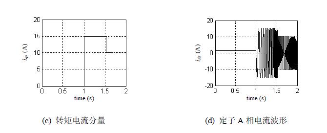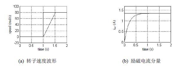 系统仿真结果如图4 所示。图4(a)所示是系统在额定负载条件下的转速阶跃响应波形。在t=1s 时刻前,系统处于静止励磁阶段,以建立额定转子磁通,如图4(b)所示。T=1s 时刻,系统转速给定由0 阶跃为80 rad/s ,该矢量控制系统的转速调节器迅速饱和,电机转速在最大转矩作用下以恒定加速度接近给定值,并在0.5s 内到达稳态,而且基本上没有稳态误差和超调。图4(c)所示为控制系统的转矩电流分量。图4(d)为定子电流A 相的电流波形。从仿真结果可以看出,该矢量控制系统的转速阶跃响应既没有超调,也没有稳态误差,而且在整个动态过程中,转子励磁电流分量基本保持不变,说明在负载扰动过程中矢量控制系统都能保持电机励磁电流分量和转矩电流分量的解耦控制,并具有良好的快速性。