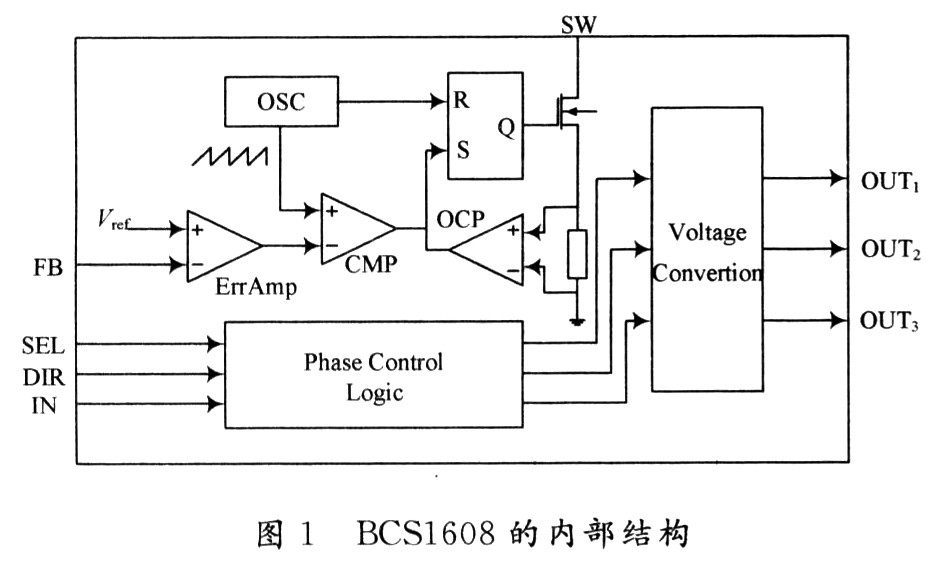 BCS1608可实现两相或三相高压输出,切换方便。其应用范围包括录像机、CD/DVD播放机、汽车音频等音像设备,PC外围设备,汽车导航系统和办公设备等。BCS1608的内部结构如图1所示。