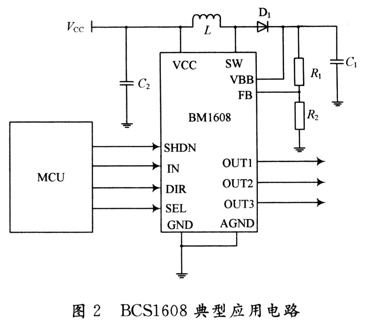 BCS1608的外围电路简单,需要快恢复二极管、电感和电容各1个与内部电路组成Boost升压电路,电阻2个用于反馈电压,再外加1个电容起滤波作用,其简单应用电路如图2所示。