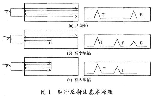 脉冲反射法的基本原理如图1所示,一般只利用一个探头发射兼接收。当工件完好时,显示器上只有始波T和底面回波B,如图1(a)所示。当工件中有小于声束截面的小缺陷时,在始波T和底波B之间还有缺陷回波F出现,如图1(b)所示。根据缺陷波F的高度可对缺陷的大小进行评估,根据缺陷回波F与始波T之间的时间差可以得到缺陷的埋藏深度。有缺陷回波时,底面回波高度下降。当工件中有大于声束截面的大缺陷时,超声波束全部被缺陷反射,显示器上只有始波T和缺陷回波F,底波B消失,如图1(c)所示。