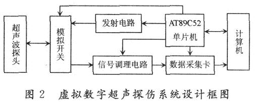 虚拟超声探伤系统的总体结构如图2所示。该系统以AT89C52单片机为核心控制器件,数据采集由计算机结合专用数据采集卡进行完成,然后利用计算机软件对数据进行运算、分析和处理,结合LabVIEW应用软件进行探伤系统的面板设计和部分功能的设计和构建,对测试结果进行显示。单片机控制发射电路发射400 V的高压窄脉冲,激励探头产生超声波,并随之切换开关至信号接收电路。同时启动数据采集卡进行数据采集工作。单片机控制系统与计算机之间的通讯(如脉冲重复频率、脉冲占空比和增益调节等)采用USB接口来进行。