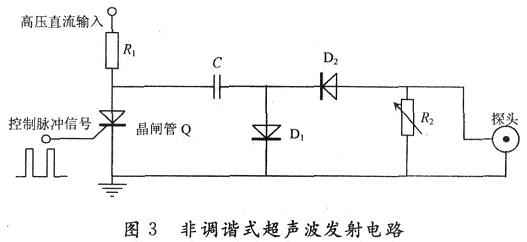 超声波的发射电路是脉冲回波法超声探伤仪的关键部分,对于超声探伤系统的性能具有很大的影响。发射电路通常有调谐式和非调谐式两种。调谐式电路中有调谐线圈,谐振频率由调谐电路的电感、电容决定,发出的超声脉冲频带较窄。非调谐式电路发射一尖峰脉冲,脉冲的频带较宽,可以适应不同频带范围的探头,此时发射出的超声波频率主要由压电晶片的固有参数决定。该系统采用德国K.K公司(Krautkramer)的B5S单晶纵波直探头。该探头具有5 MHz的标称频率,15~6 000 mm的工作量程和11O mm的近场长度。为便于系统的灵活调试,采用非调谐式发射电路,其脉冲控制参数可以通过核心控制器AT89C52单片机方便地进行修改设定,发射电路如图3所示。