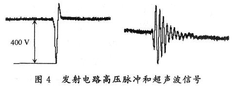 在发射电路中,高压直流通过限流电阻R1,隔直电容C被充电到VH,在常用的超声检测系统中,VH电压在数十伏至几百伏的范围内。为充分激发探头的压电性能,采用了400 V的高压直流电源模块。晶闸管Q作为一个高速开关器件在此受单片机产生的脉冲信号控制。在低电平时,晶闸管Q处于截至状态,电容C被充电到400 V,在高电平信号到达时,晶闸管Q处于导通状态,引起电容C经晶闸管Q和可调电阻R2放电,在R2上产生激励探头的高压脉冲。可变电阻R2决定了电路的阻尼情况,可以通过改变R2的阻值来改变发射的强度。电阻大时阻尼小,发射强度大,仪器的分辨力低,适合探测厚度大,对分辨率力要求不高的试件。电阻小时阻尼大,分辨率高,在探测近表面缺陷时或对分辨力要求较高时予以采用。该设计选用双向晶闸管BTl36—600,该晶闸管具有600 V的反向峰值电压和4 A的额定平均电流。为充分驱动该晶闸管工作,特意选用了双路功率MOSFET驱动器ICL7667设计了驱动电路。发射电路产生的高压脉冲和超声波信号如图4所示。