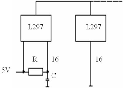利用L297的SYNC引脚可实现多个L297同步工作,其连接方式如图3所示,只将RC网络接于一芯片上,而其余芯片的OSC引脚均接地,这样可避免接地杂波的引入问题。