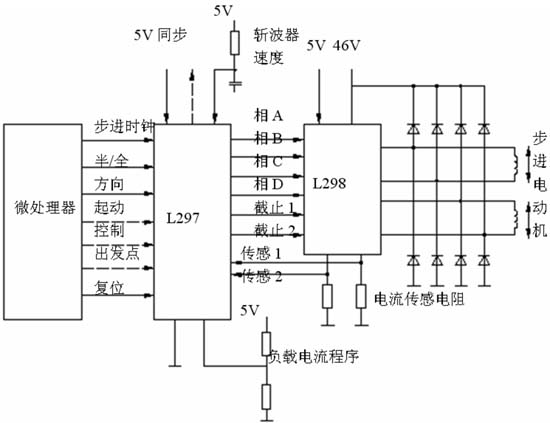 SGS公司的L297单片步进电机控制集成电路适用于双极性两相步进电机或四相单极性步进电机的控制,与两片H桥式驱动芯片L298组合,组成完整的步进电机固定斩波频率的PWM恒流斩波驱动器。