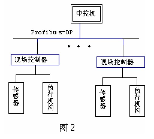 对于不同的染色品种,对应的温度工艺曲线也是不同的,若将所有可能用到的温度曲线存入现场控制器中,则对现场控制器的内存要求很高,因此本系统设计通过中控机,将工艺人员设定的不同的温度工艺曲线,全部由工作人员在中控机上输入后经PROFIBUS—DP 现场总线下传给现场控制器,现场控制器根据接收的温度工艺曲线进行温度控制,同时现场控制器可以随时向中控机申请修改温度工艺曲线的参数。在网络中断时,现场控制器可以保存当前的温度工艺曲线,并且具有断电长期保存当前温度曲线的功能,同时可以将现场的温度等信号上传至中控机,形成监控界面,如果需要可以通过网卡将中控机同工厂信息网以及Internet 网相连,实现底层到高层的信息共享。系统的结构图如图2 所示。
